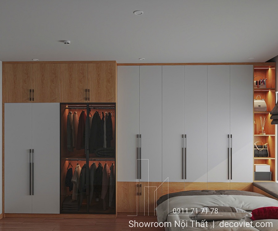 Tủ quần áo âm tường lớn được làm từ gỗ công nghiệp cao cấp, kéo dài từ bức tường gần cửa vào đến dưới chân giường, vừa gọn gàng vừa tiết kiệm diện tích. Với thiết kế đơn giản nhưng tinh tế, chiếc tủ quần áo gỗ hòa mình vào không gian, tạo sự liền mạch và thoáng đãng.
