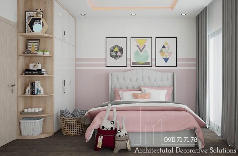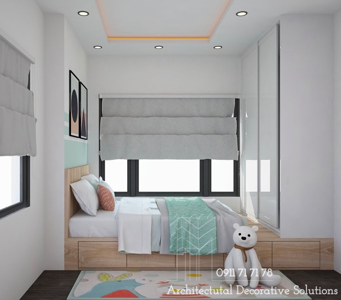 Phòng ngủ cho bé trở nên rộng rãi hơn khi kết hợp giữa giường giật cấp và tủ quần áo, gia chủ có thể ngồi dựa cửa đọc những quyển sách vừa ngắm nhìn khung cảnh bên ngoài.