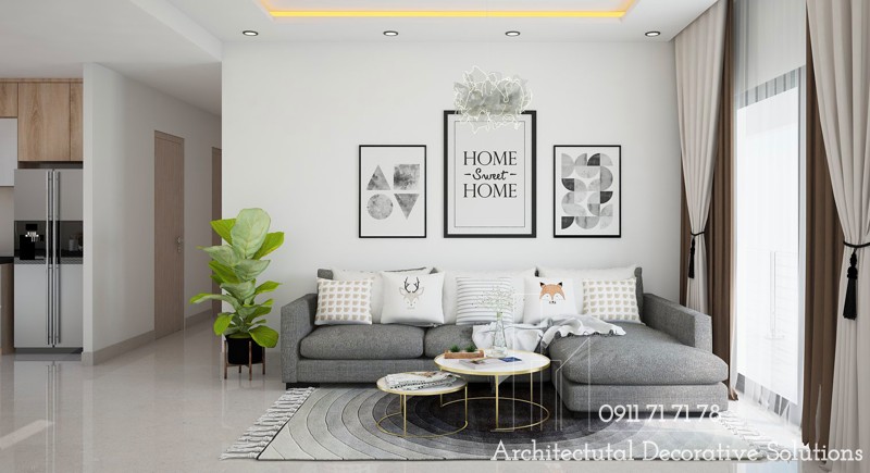 Sofa xám kế hợp tông trắng của nhà giúp bật tone phòng khách trở nên sáng hơn, ngoài ra còn kết hợp với tranh treo tường giúp không gian phòng khách thêm sinh động.