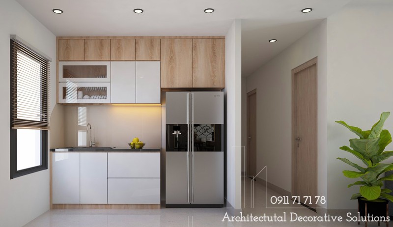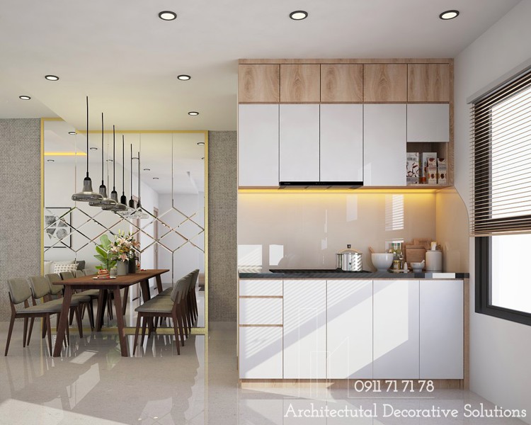 Thiết kế nội thất phòng bếp dài dọc theo tường nhà. Tủ bếp từ chất liệu gỗ tự nhiên toát lên vẻ sáng bóng. Đồng thời hệ thống tủ bếp rộng rãi giúp tăng không gian lưu trữ.