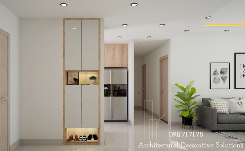 Thiết Kế Nội Thất Căn Hộ The Sun Avenue- Hệ tủ giày kết hợp với kệ trang trí giúp gia đình lưu trữ được nhiều đồ dùng.