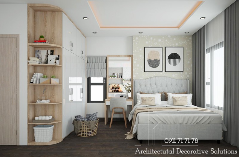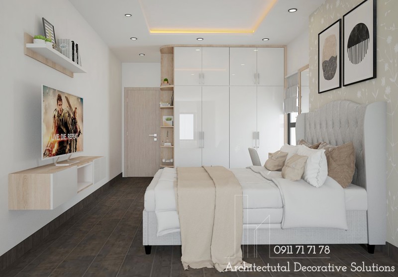 Thiết kế nội thất chung cư The Sun Avenue 3pn – Phòng Master của đôi vợ chồng bố trí nội thất khéo léo, vừa hiện đại sang trọng nhưng vẫn đan xen cảm giác ấm áp, thân thuộc. Từ tủ quần áo, bàn trang điểm hay kệ TV trang trí đều được thiết kế vừa vặn, loại bỏ được mọi góc chết của căn phòng.