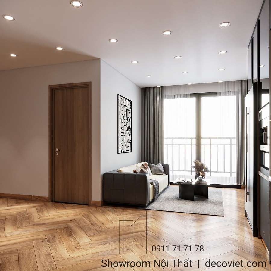 Toàn bộ căn hộ được lát sàn gỗ kiểu xương cá đồng nhất, tạo nên một vẻ đẹp liền mạch và ấm cúng cho không gian sống. Kiểu lát sàn này không chỉ nâng cao tính thẩm mỹ mà còn mang lại cảm giác gần gũi và dễ chịu. Ánh sáng từ đèn âm trần kết hợp hoàn hảo với ánh sáng tự nhiên từ cửa sổ, làm cho không gian trở nên sáng sủa và thoáng đãng. Điều này không chỉ tạo ra một môi trường sống lý tưởng để thư giãn mà còn làm nổi bật sự tiện nghi trong từng góc nhỏ, là nơi lý tưởng để tận hưởng những khoảnh khắc sum vầy và gắn kết tình cảm gia đình.