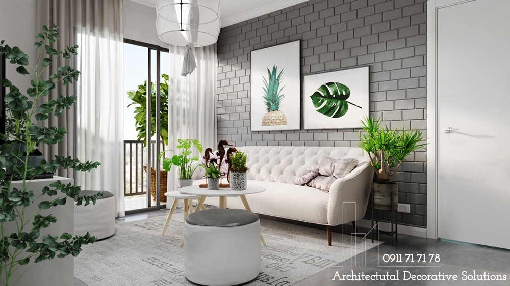 không gian đầu tiên của chúng tôi là một căn hộ được trang trí màu xám, trắng và xanh lá cây. Cây xanh nổi bật trên nền bức tường gạch trần màu xám. Thảm sàn cũng được chọn màu xám làm cho ranh giới màu sắc dường như được xóa nhà. Ghế, đèn chiếu sáng cùng rèm cửa màu trắng mang lại sự tương phản dịu dàng với sắc xám.