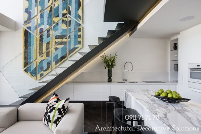 Tối giản các phần của cầu thang bằng cách sử dụng thiết kế cầu thang mở để tạo sự liên kết giữa hai không gian. Trong mẫu tủ bếp trên, màu sắc chủ đạo của cầu thang và bếp là xám và đen.