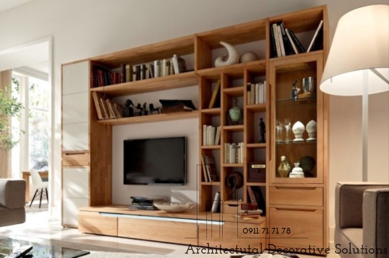 Nếu phòng khách của bạn tương đối rộng rãi thì những mẫu kệ tivi có kích thước lớn được thiết kế đa năng vừa là kệ đựng tivi vừa là kệ trang trí đồng thời cũng là kệ sách, thật là hữu ích, thông minh mà không kém phần hiện đại.