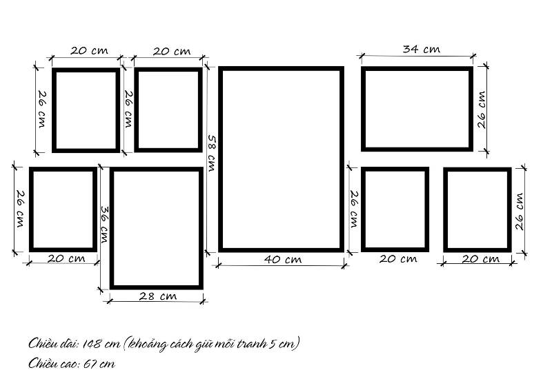 Kích thước: Chiều dài 148cm, chiều cao 67cm (Khoảng cách giữa các tranh 5cm).